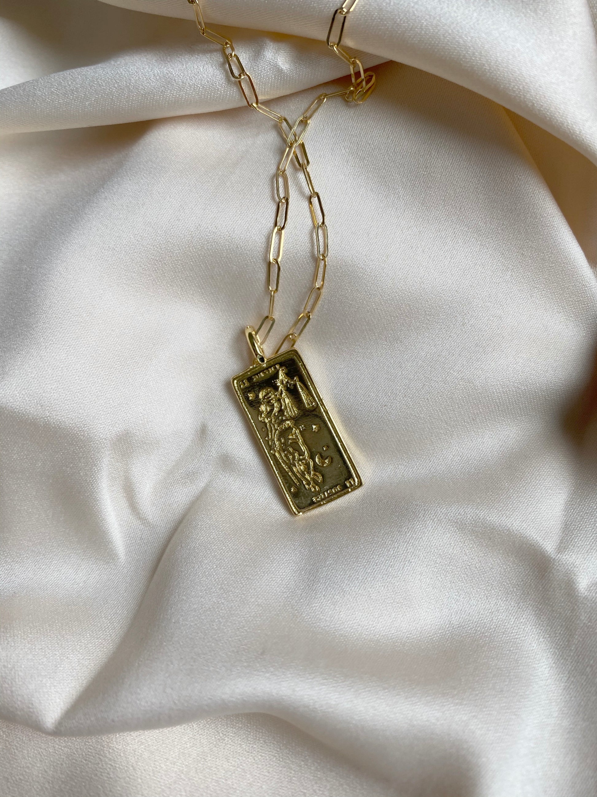 Gold filled justice tarot card pendant on an 18 inch link chain.