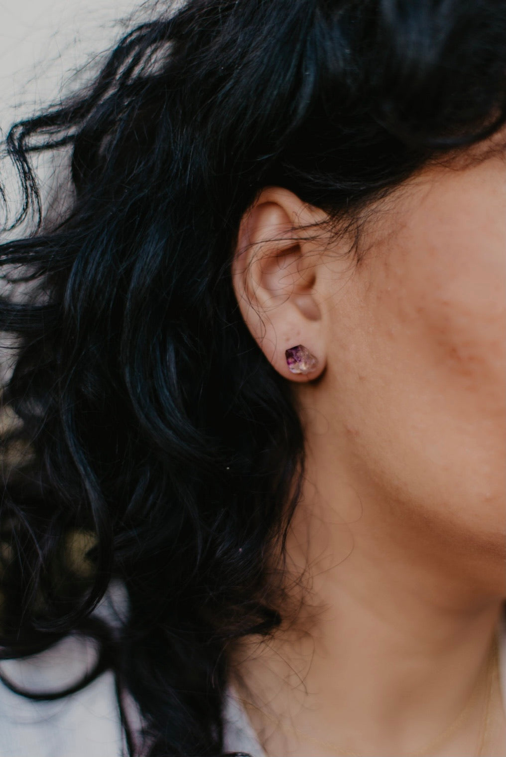 Natural, free-formed amethyst, aquamarine or crustal quartz fastened to a 14k gold filled post.